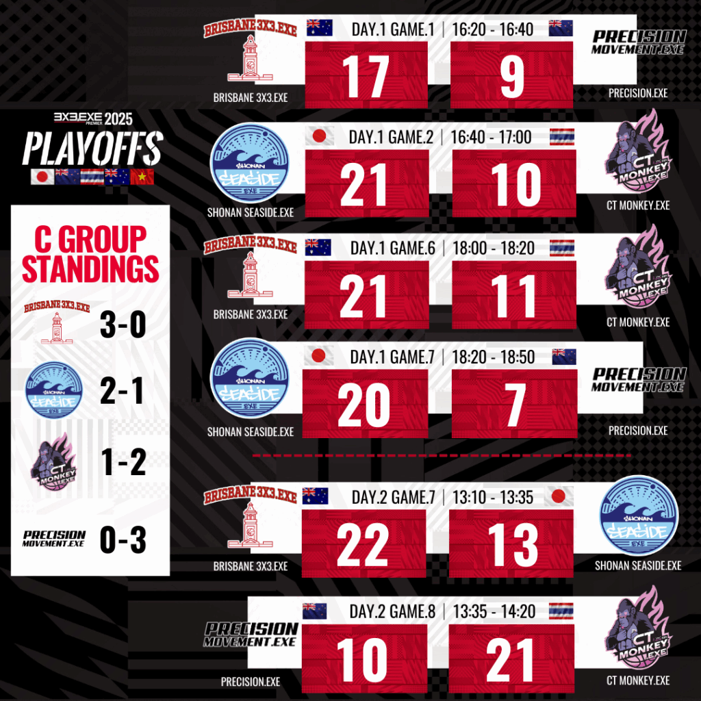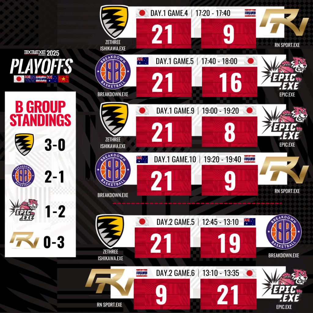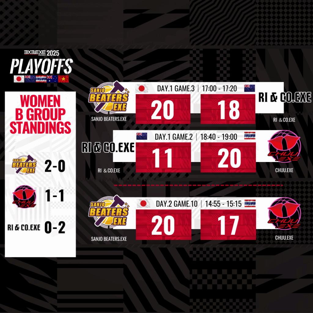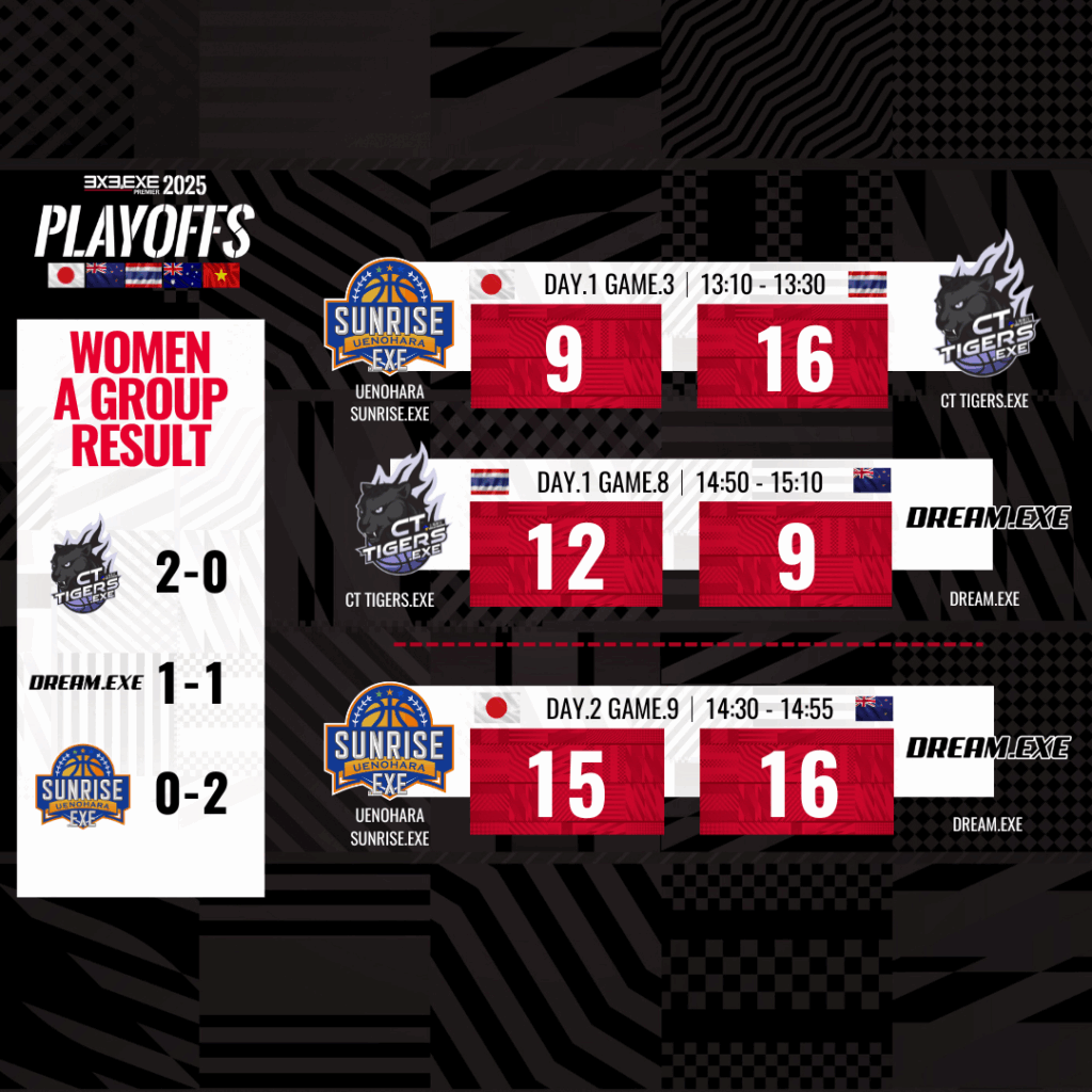 ULTREX by ライブドアニュース 3x3 「3×3.EXE PREMIER 2025 PLAYOFFS」が閉幕!男子はBRISBANE、女子はCT TIGERSが初優勝 3x33x3バスケ 2025.09.29 17:00 「3×3.EXE PREMIER 2025 PLAYOFFS」が閉幕!男子はBRISBANE、女子はCT TIGERSが初優勝 著者:ULTREX編集部 SHARE この記事の画像をもっと見る(全23枚) 優勝したBRISBANE 3X3.EXE(左)とCT TIGERS.EXE(右) INDEXPLAYOFFSの開催と結果男子部門の詳細女子部門の詳細競技の概要開催概要 3人制バスケットボールのグローバルプロリーグ「3×3.EXE PREMIER」の2025シーズンが、9月27日(土)・28日(日)に大阪市で開催された2025 PLAYOFFSをもって閉幕した。この大会は、5カ国から99チーム、500名以上の選手が参加し、年間王者を決定する重要なイベントとなった。 PLAYOFFSの開催と結果 今回のPLAYOFFSは、大阪府大阪市の「グラングリーン大阪 ロートハートスクエアうめきた」にて行われ、男子カテゴリーではBRISBANE 3X3.EXE(オーストラリア)が初優勝を果たし、女子カテゴリーではCT TIGERS.EXE(タイ)がこちらも初の栄冠を手にした。この結果、日本以外のチームが優勝を飾るのはリーグ創設以来初めての出来事となる。 男子部門の詳細 男子の優勝チーム、BRISBANE 3X3.EXEは、昨年のBRISBANE CITY BLUE.EXEからメンバーが移籍し構成されたチームで、昨年はPLAYOFFSでベスト4の成績を収めていた。彼らはリベンジを果たすべく挑戦し、個々の能力や連携の向上が見事に功を奏した。特に、MVPに輝いたカイ・ウッドフォール選手は、ゲームメイクを担い、チームの得点を重ねる重要な役割を果たした。 ■大会結果:DAY.1(9月27日)男子予備予選トーナメント ■大会結果:DAY.1 – 2(9月27日-28日)男子予選グループ ■大会結果:DAY.2 (9月28日)男子決勝トーナメント 【決勝トーナメント・順位】1位:BRISBANE CITY.EXE (オーストラリア)2位:MELBOURNE MAGIC.EXE(オーストラリア)3位:ZETHREE ISHIKAWA.EXE(日本)4位:UTSUNOMIYA BREX.EXE(日本) 女子部門の詳細 女子部門の優勝を飾ったCT TIGERS.EXEは、タイでの2位チームとしてPLAYOFFS初出場を果たした。彼女たちは、敵チームの研究に多くの時間を費やし、初戦で日本1位のUENOHARA SUNRISE.EXEを撃破するなど快進撃を見せた。決勝では日本2位のSANJO BEATERS.EXEを下し、初優勝を達成。MVPにはスロイファ・フェトニン選手が選ばれ、彼女の活躍がチームを優勝へと導いた。 ■大会結果:DAY.1-2 (9月27日-28日)女子予選グループ ■大会結果:DAY.2 女子決勝 1位:CT TIGERS.EXE(タイ)2位:SANJO BEATERS.EXE(日本) 競技の概要 2025年のPLAYOFFSは、予備予選トーナメント、グループリーグ、決勝トーナメント方式で行われた。男子の出場チームは22チーム、女子は6チームで、日本からはそれぞれ15チームと2チームが参加した。男子の優勝はBRISBANE 3X3.EXE、女子はCT TIGERS.EXEという結果に終わった。なお、男女ともに日本以外のチームが優勝したのは今大会が初めて取った。 開催概要 大会名称:3×3.EXE PREMIER 2025 PLAYOFFS 日時:2024年9月27日(土)・28日(日) 会場:グラングリーン大阪 ロートハートスクエアうめきた(大阪府大阪市) 主催:3×3.EXE PREMIER(クロススポーツマーケティング株式会社) 承認:国際バスケットボール連盟(FIBA) 公認:公益財団法人日本バスケットボール協会(JBA)他 2025シーズンを通じて、選手たちの熱い戦いが繰り広げられ、特に初優勝を果たしたBRISBANE 3X3.EXEとCT TIGERS.EXEの活躍が光った。今後の3×3.EXE PREMIERの展開にも期待が高まる。